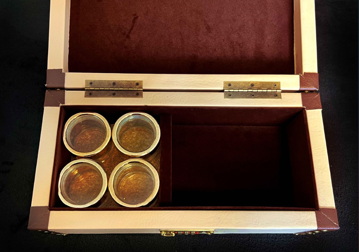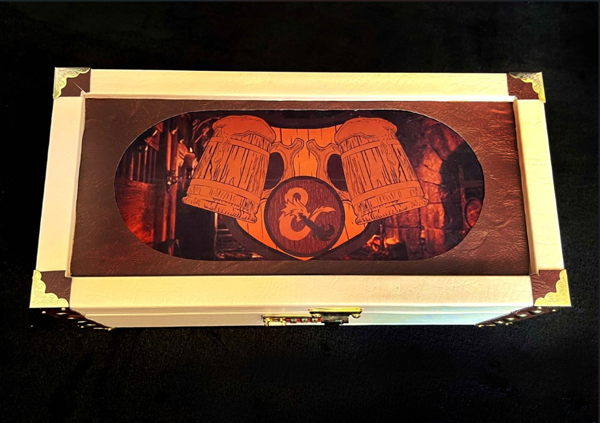 Here Barkeep! Feast your eyes on the crest of those adventures that have begun at this pub and those that keep returning! May the dice gods smile upon all their cantankerous shenanigans and heroic deeds! Metallic finish on lid and comes with 4 gold jars. Trading Card Boxes sold separately.